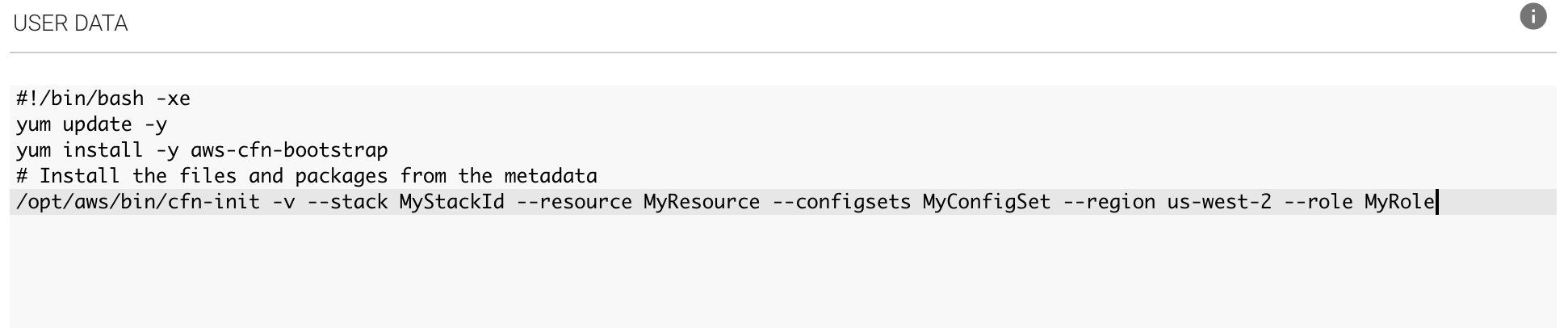 /opt/aws/bin/cfn-init -v --stack <cfn-stack-id> --resource <logical-resource> --role <my-role>